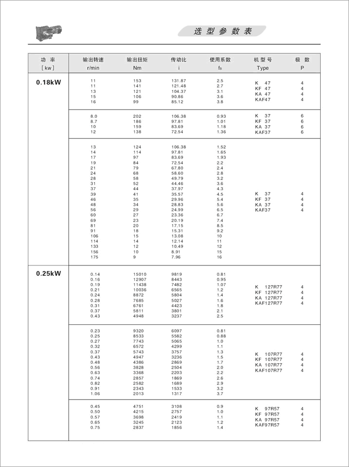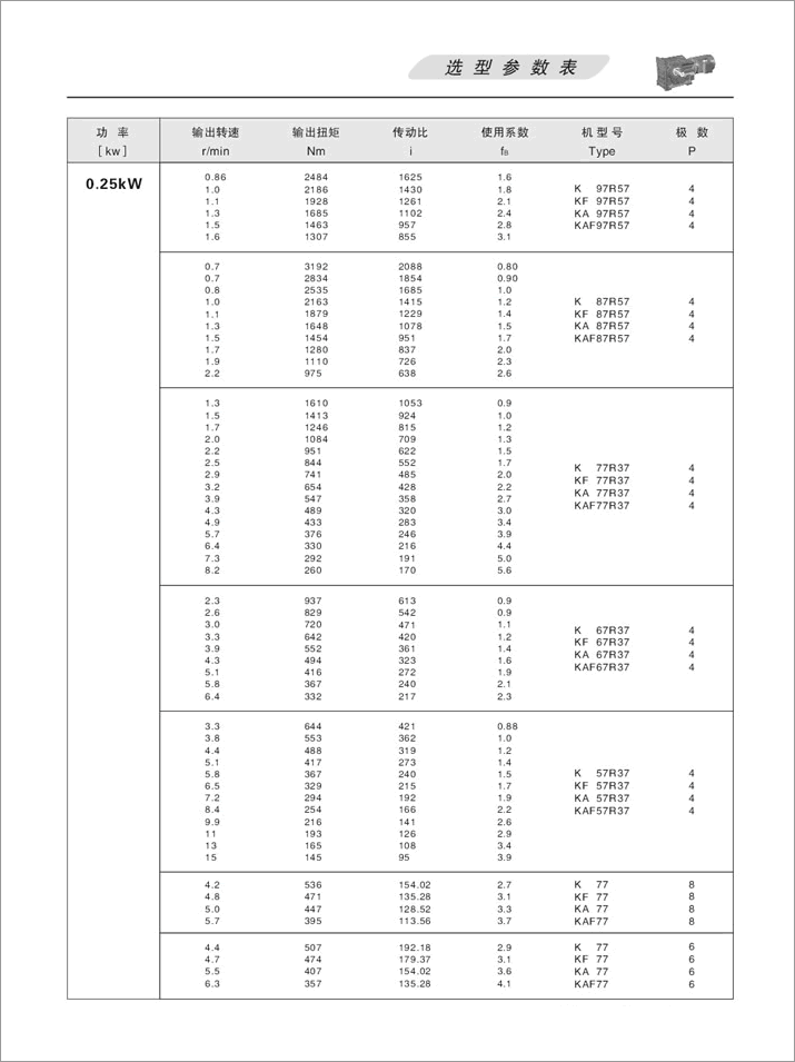 K螺旋錐齒輪減速機選項參數(shù)表0.25KW
