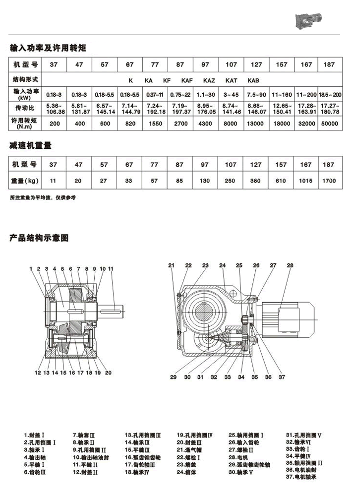 K螺旋錐齒輪減速機(jī)輸入功率及許用轉(zhuǎn)矩、減速機(jī)重量、產(chǎn)品內(nèi)部結(jié)構(gòu)示意圖