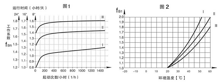 S系列選型:總工作系數(shù)f∑取決于每天工作時間,每小時起動次數(shù)的工作系數(shù)fBn(圖1)和環(huán)境溫度變化的工作系數(shù)fB1(圖2),其關(guān)系為f∑ =fBn × fB1使選型表中的使用系數(shù)fB>f∑。